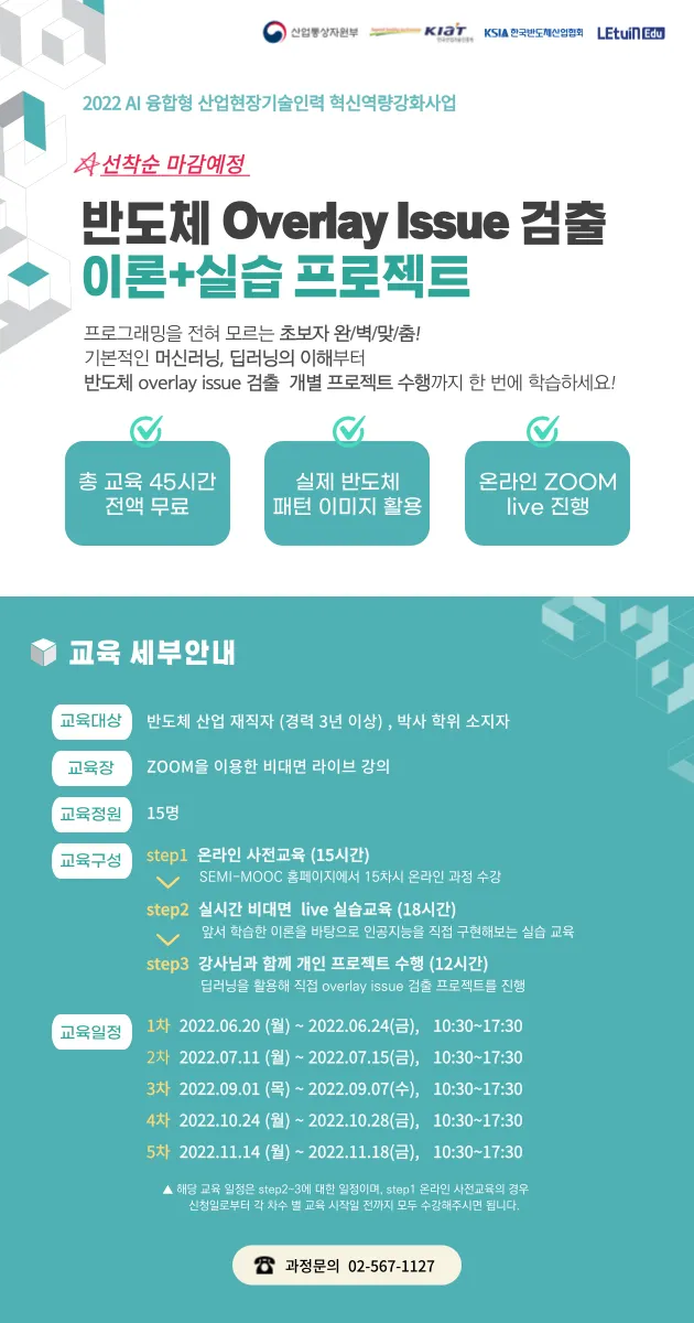 반도체 관련 기업 3년 이상 재직자에 한 하여 산업통상부에 주관 '2022 반도체 산업 AI 딥러닝 머신 비전기술(반도체 overlay issue 검출 이론+실습 프로젝트)' 과정을 100% 전액 무료로 제공해드리고 있습니다. (*개별 프로젝트 진행, 교육 수료증 발급)